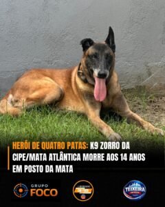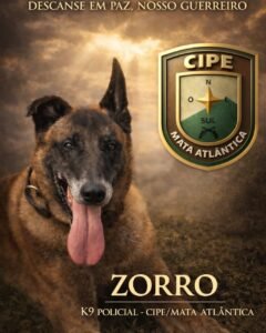 A CIPE/Mata Atlântica lamenta o falecimento do cão policial Zorro, ocorrido na Base Cléber, em Posto da Mata. Integrante da Unidade desde 2016, oriundo do Canil Escola Thor e Tina (SP), destacou-se como cão especializado na detecção de entorpecentes, atuando com precisão em diversas operações na Bahia, Minas Gerais e Espírito Santo.
