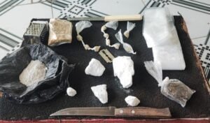 No momento da abordagem, Y. C. R., 17 anos, surgiu no portão do pequeno sobrado e, ao notar a presença policial, demonstrou extremo nervosismo, sendo também revista. Com ela, os militares localizaram uma mochila contendo 110 gramas de crack e 120 gramas de cocaína, além de facas e embalagens plásticas — materiais característicos do fracionamento e distribuição de entorpecentes. O imóvel não possuía qualquer característica de moradia, apenas colchões no chão e grande quantidade de bitucas de cigarro, indicando tratar-se exclusivamente de um ponto de tráfico.