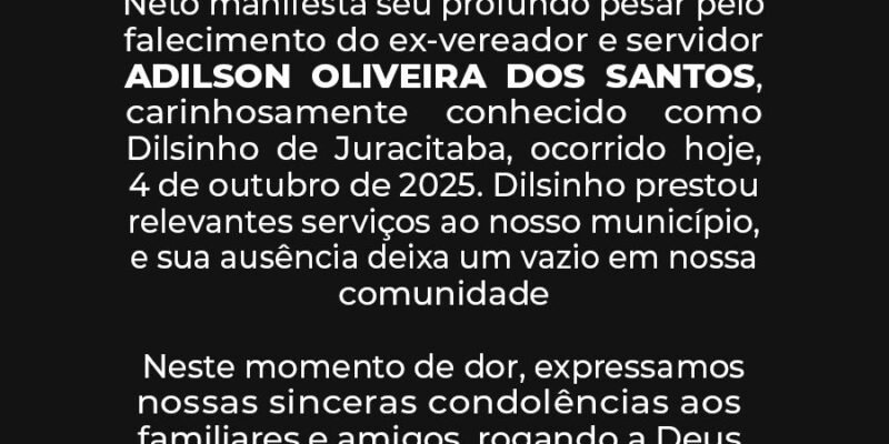 Dilsinho prestou relevantes serviços ao nosso município, e sua ausência deixa um vazio em nossa comunidade. Neste momento de dor, expressamos nossas sinceras condolências aos familiares e amigos, rogando a Deus que lhes conceda conforto e paz.